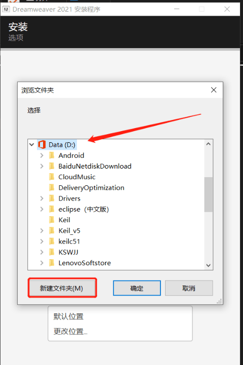 在弹出浏览文件夹窗口中选择一个非系统盘,比如D盘,我们新建一个文件夹,命名为“Dw2021”,然后确定